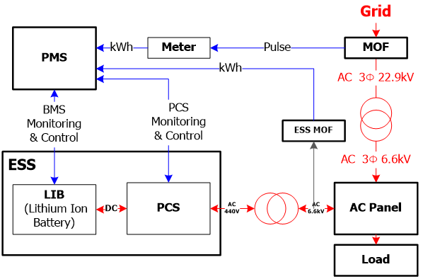 - EMS (Energy Management System): 부하의 상태를 모니터링하고 ESS를 연동제어하여 ESS 운용에 의한 편익을 최대화하는 역할