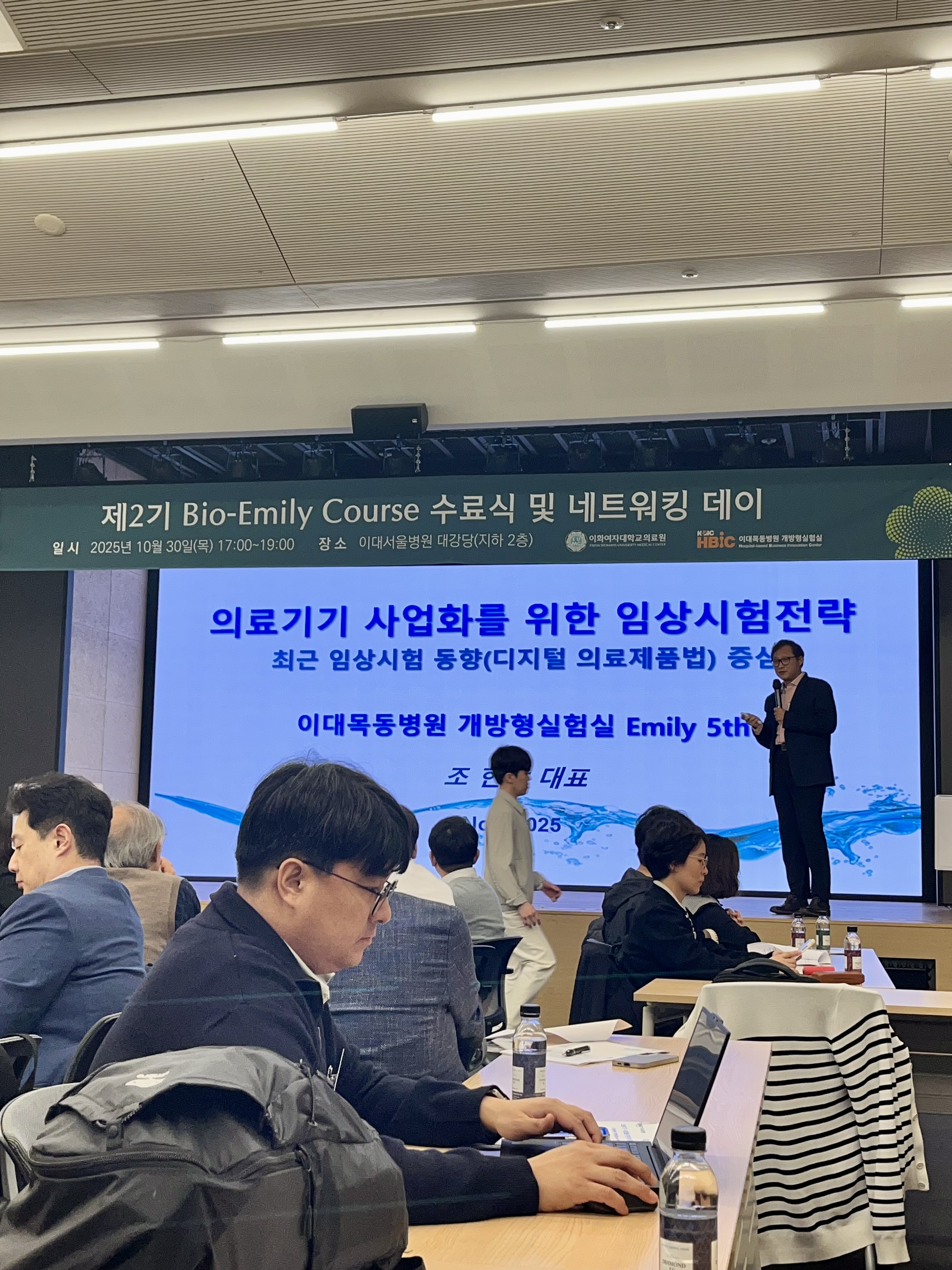 사이클룩스의 조현상 대표는 25년 10월 30일 마곡 이대서울병원 컨벤션 센터에서 개최된 제2기 Bio-Emily course 수료식에서 '의료기기 사업화를 위한 임상시험전략'에 대해 특강을 했습니다. 이날 수료식에는 이대목동병원 개방형실험실 참여 기업과 이대목동병원, 이대서울병원의 자문의, 연구자들이 참석하여 의료기술의 사업화를 위한 netwroking의 시간을 가졌습니다.