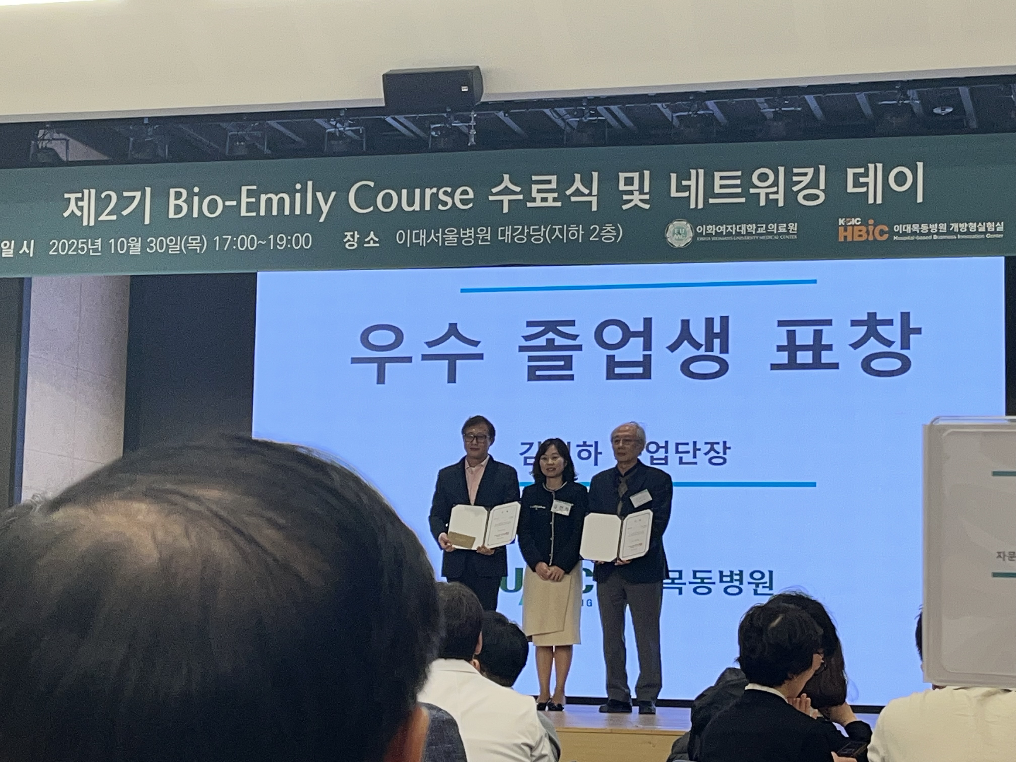 한편, 이날 수료식에서 조현상 대표는 Bio-Emily course에 대한 성실하고 적극적인 참여로 김건하 이대목동병원 개방형실험실단장으로부터 우수졸업생 표창을 수여 받았습니다.