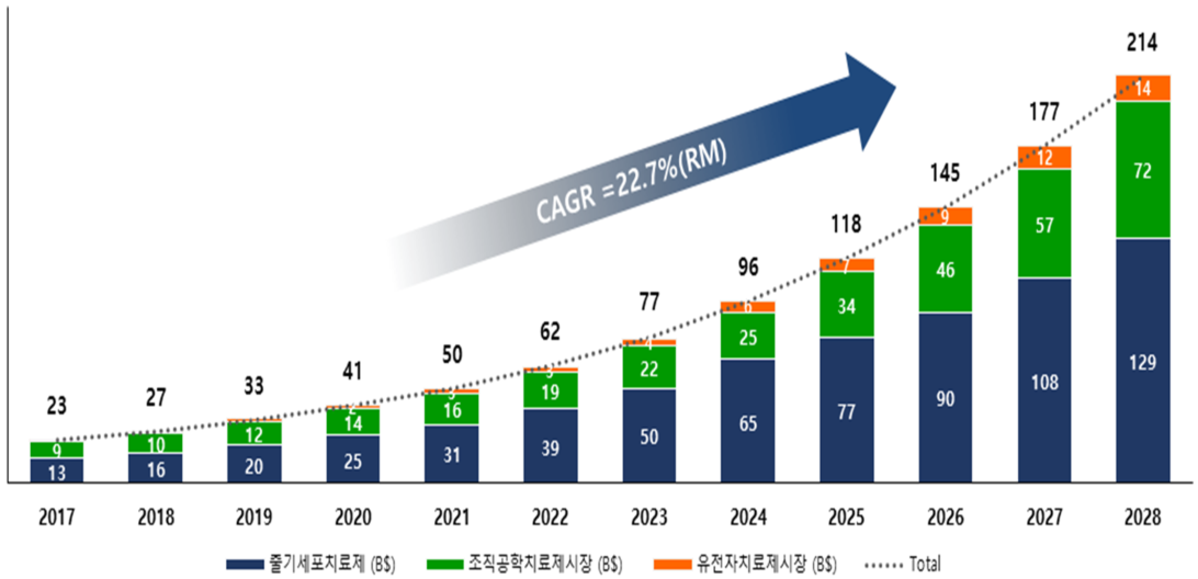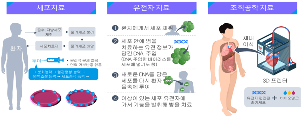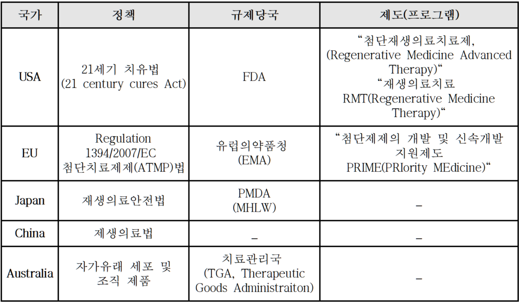 • 첨단재생의료는 “사람의 신체 구조 또는 기능을 재생, 회복 또는 형성하거나 질병을 치료 또는 예방하기 위하여 인체세포등을 이용하여 실시하는 세포치료, 유전자치료, 조직공학치료 등 대통령령으로 정하는 것(첨단재생의료 및 첨단바이오의약품 안전 및 지원에 관한 법률 제2조 1)”으로 기존 합성의약품이나 의료기기와 다른 특성을 갖는 차세대 유망의료기술로 국내외 시장이 급격히 성장