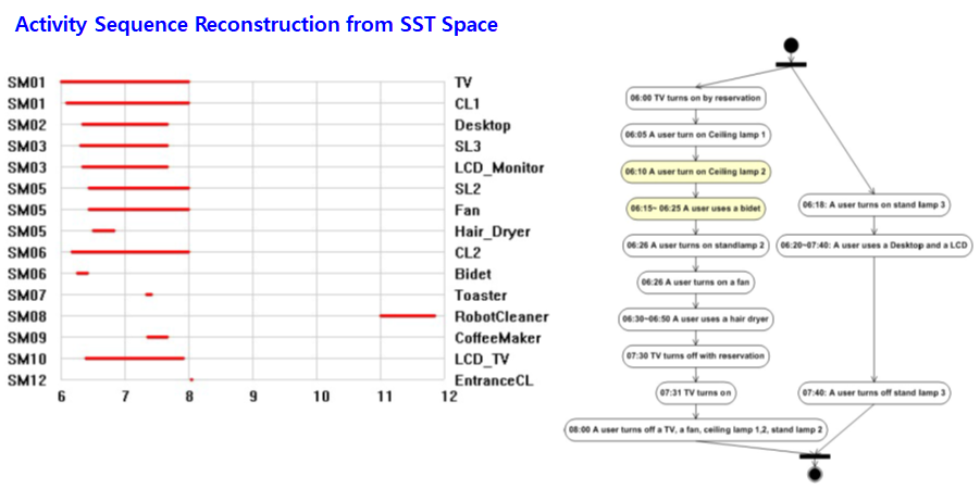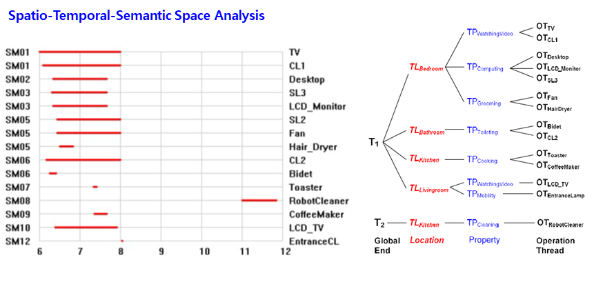 - 가전제품의 시간적 패턴(temporal pattern)과 지식기반의 결합으로 사용자의 시공간 활동 (spatio-temporal activity) 구성